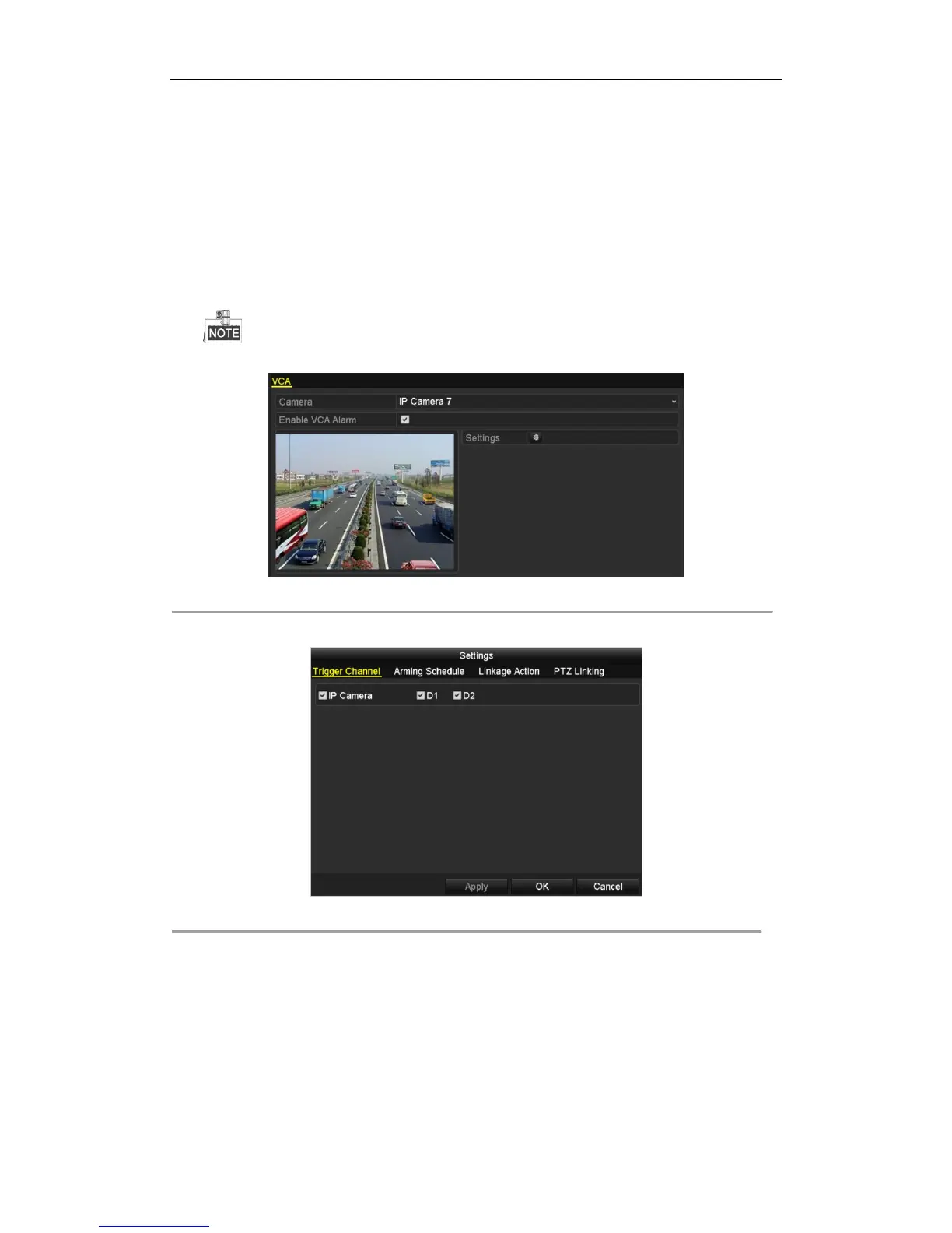 2. Check the Enable VCA Alarm checkbox and click Settings button to set up its alarm response actions.