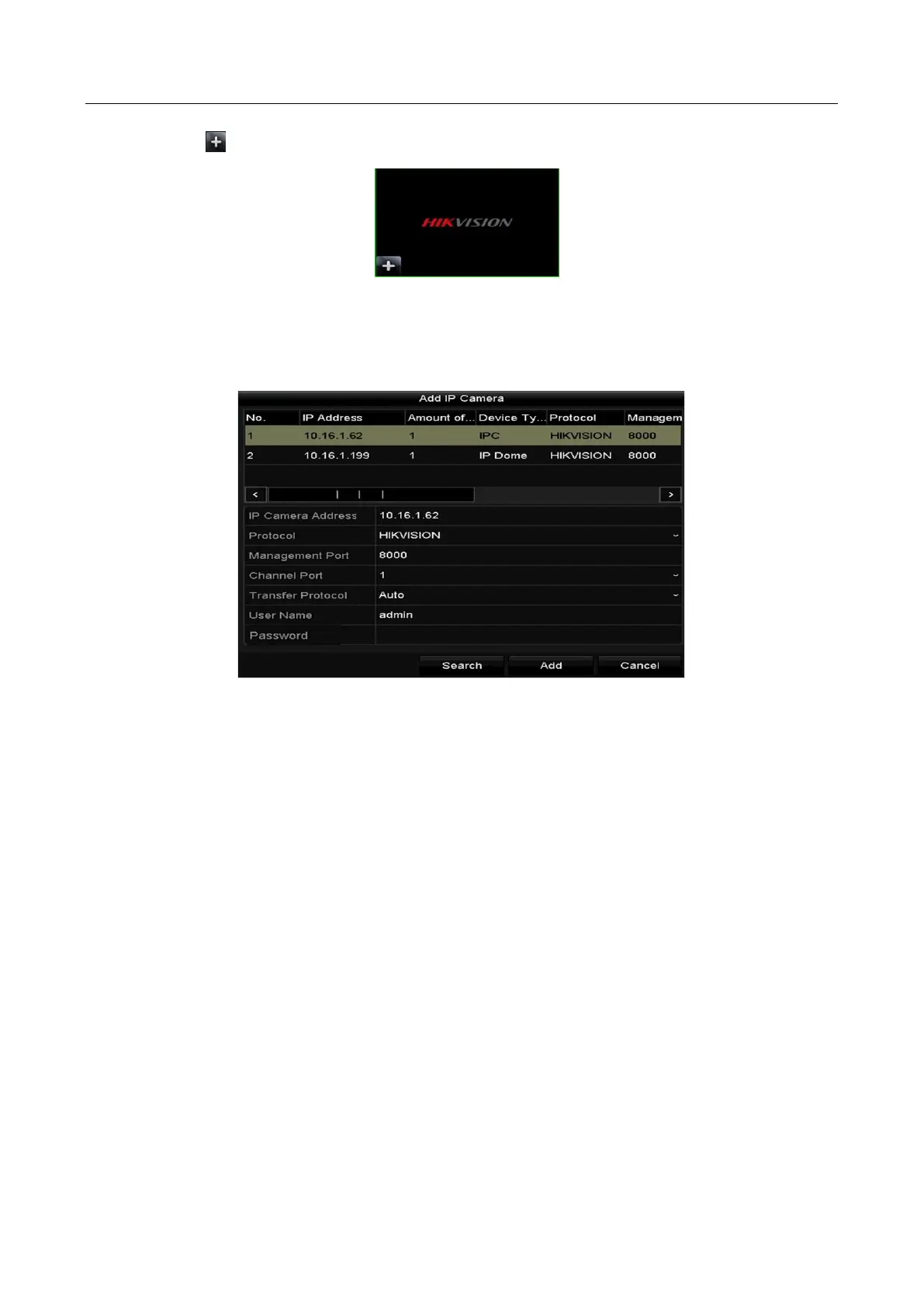 Step 2 Click the icon in the center of the windw to pop up the adding IP camera interface.