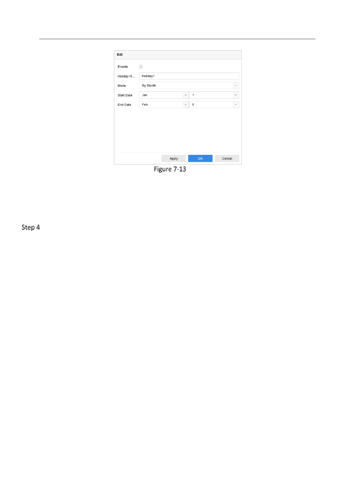 Set the schedule for the holiday recording. Refer to Chapter 7.4 Configure Recording Schedule