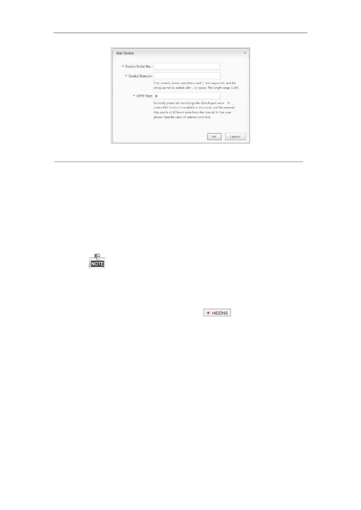 4) Input Device Serial No., Device Domain (Device Name) and HTTP Port. And click OK to