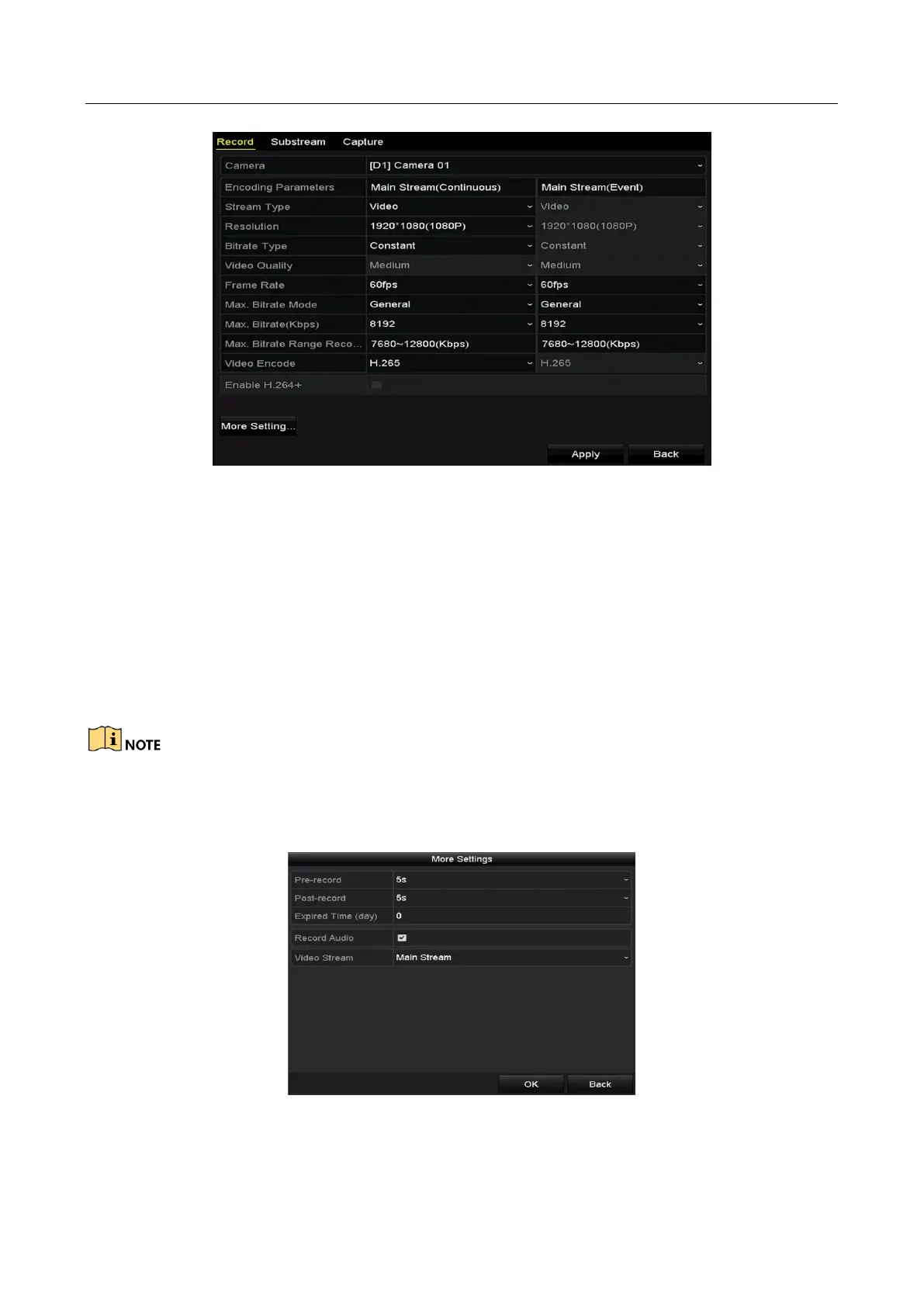 1) Select Record tab page to configure. You can configure the stream type, the resolution,