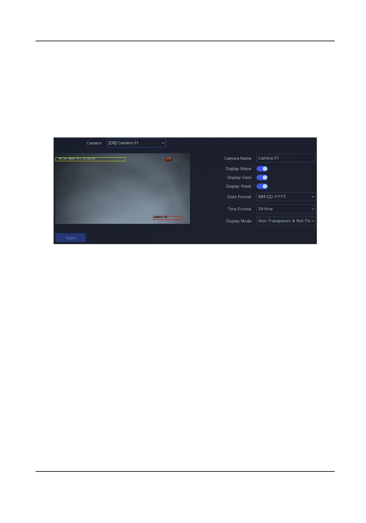 Congure OSD (On-Screen Display) sengs for the camera, including date format, camera name,