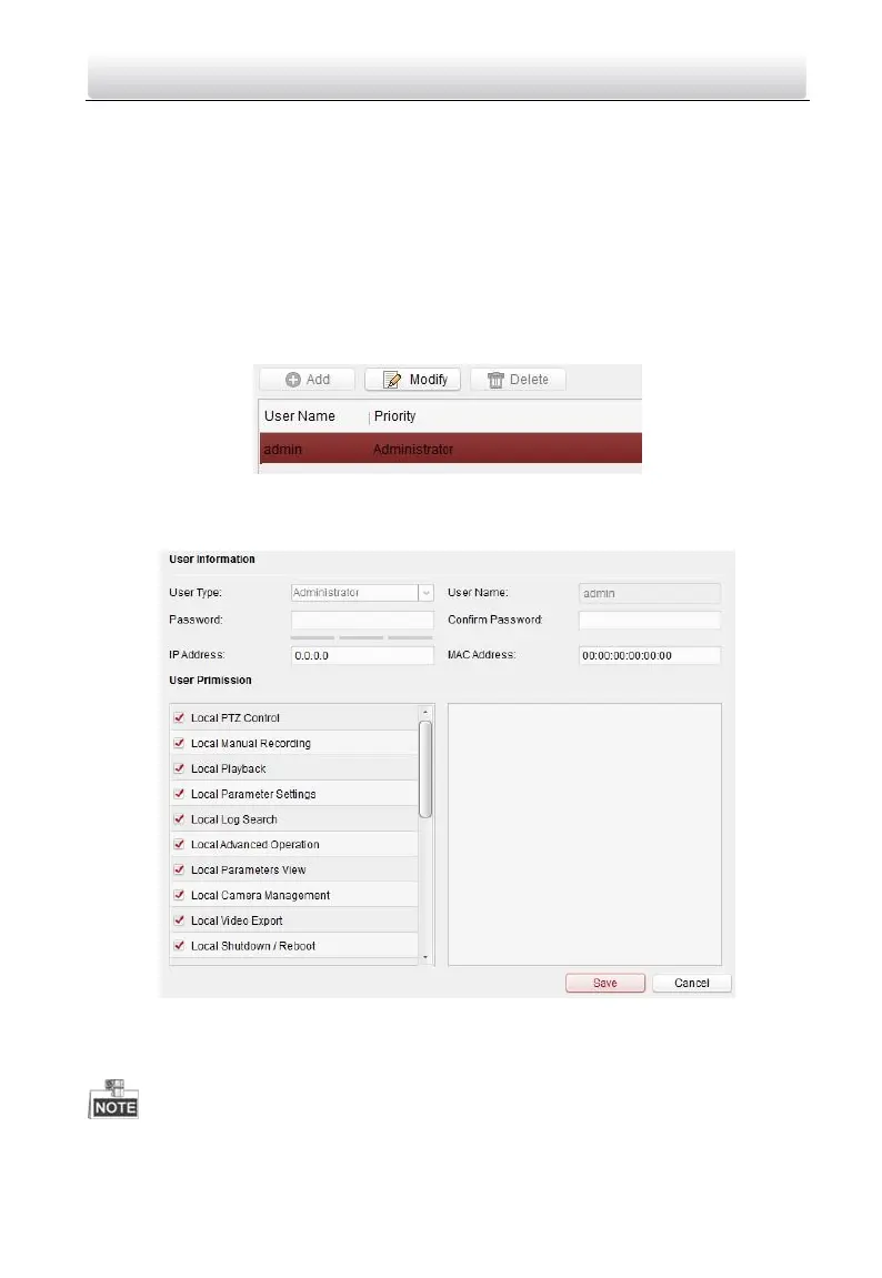 2. Select the user to edit and click the Modify button to enter the user parameter