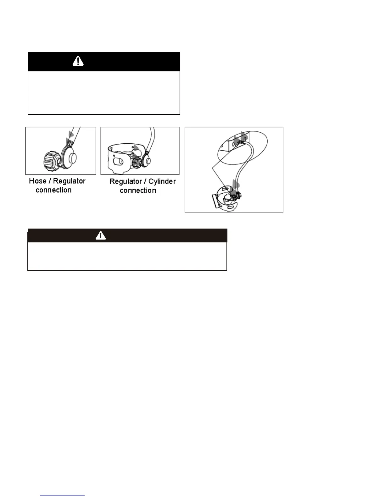 3. If leak is at regulator/cylinder valve connection: disconnect, reconnect, and perform another leak check. If you