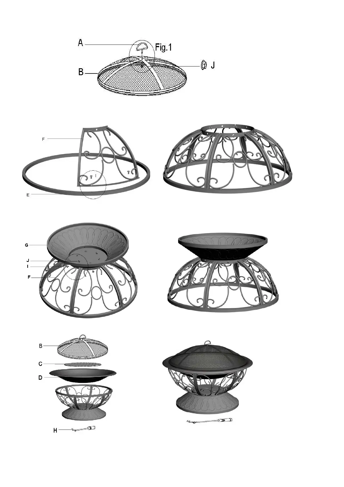 Step 4: Place D, C, and B on the assembled frame. The firepit is now ready for use.