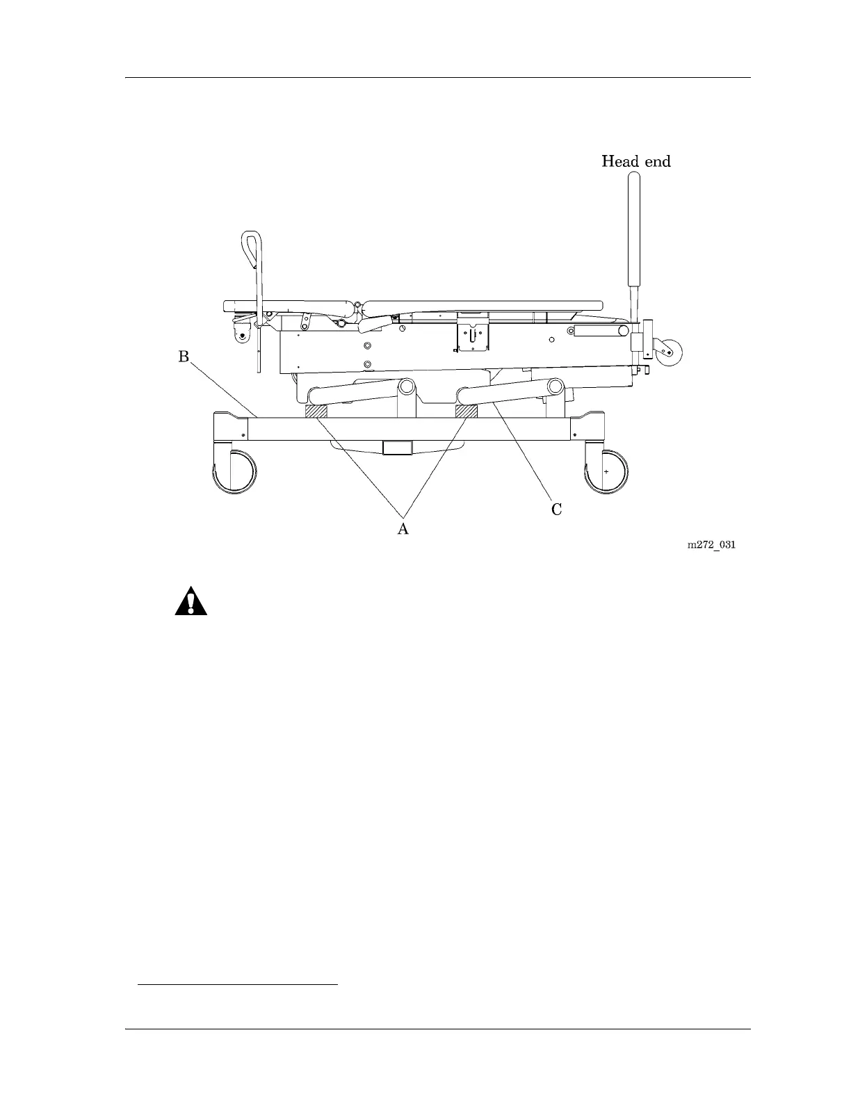 10. Deactivate the lockout function, and lower the bed until both lift arms (C)
