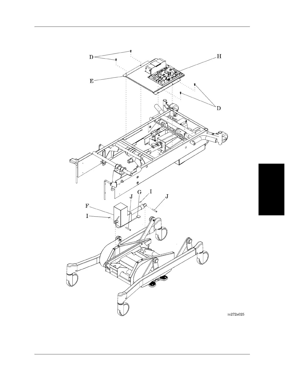 pins (J) that secure the hilow drive motor assembly (F) to the bed frame.