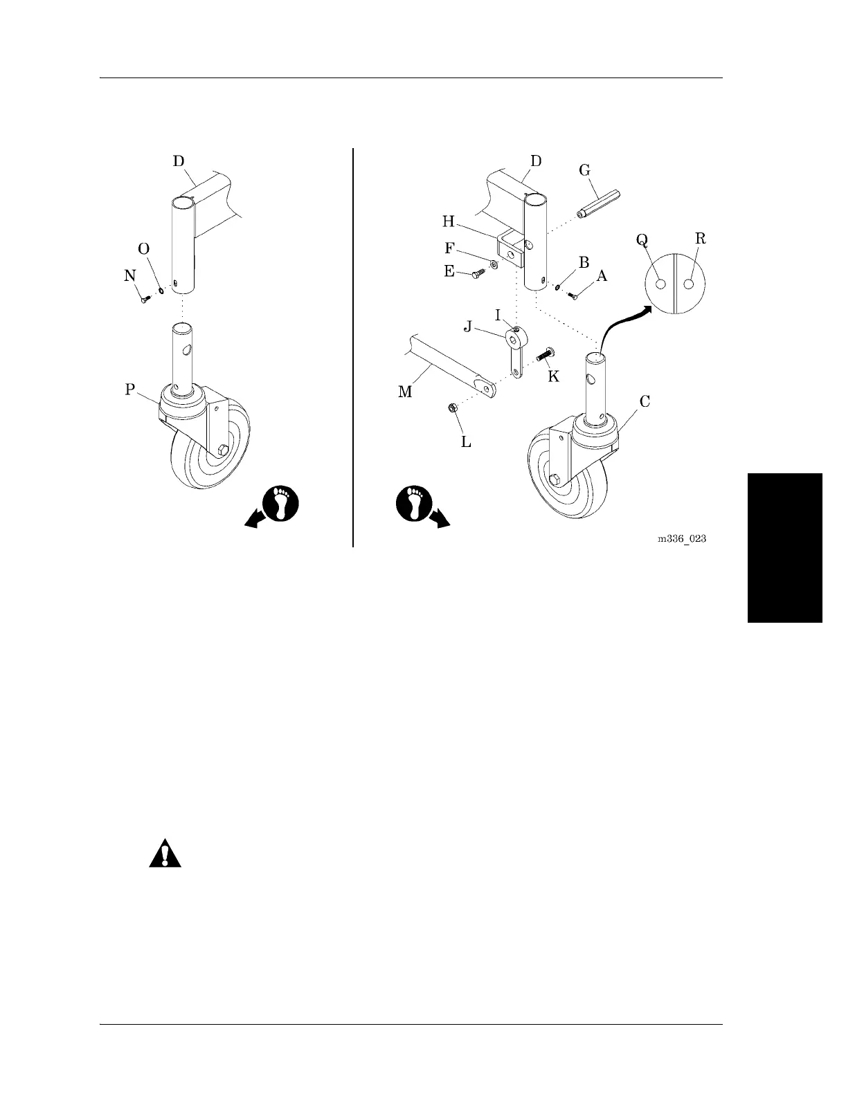 9. Remove the bolt (N) and washer (O) attaching the swivel caster (P) to the