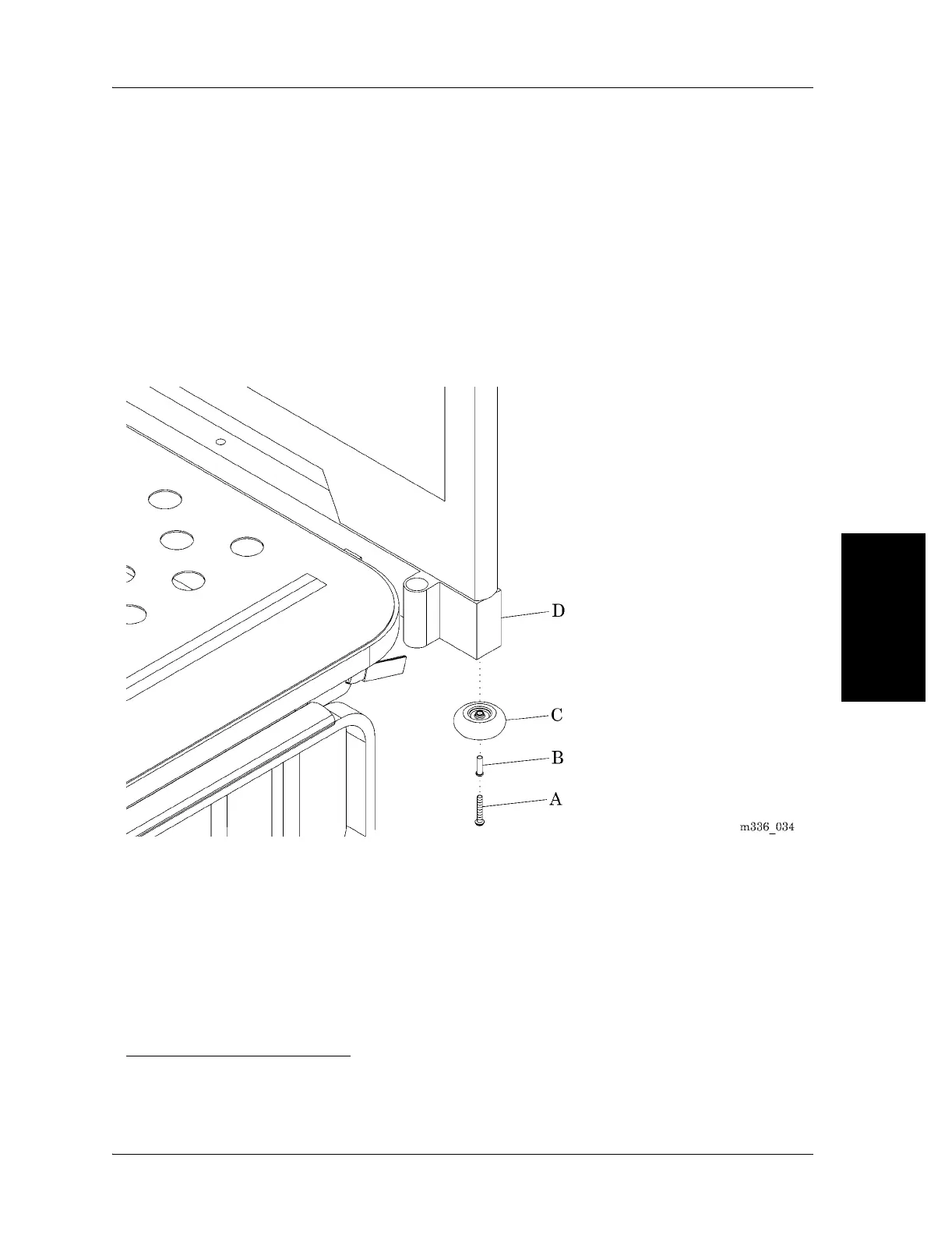 2. Remove the screw (A) and bushing (B) attaching the bumper (C) to the bed
