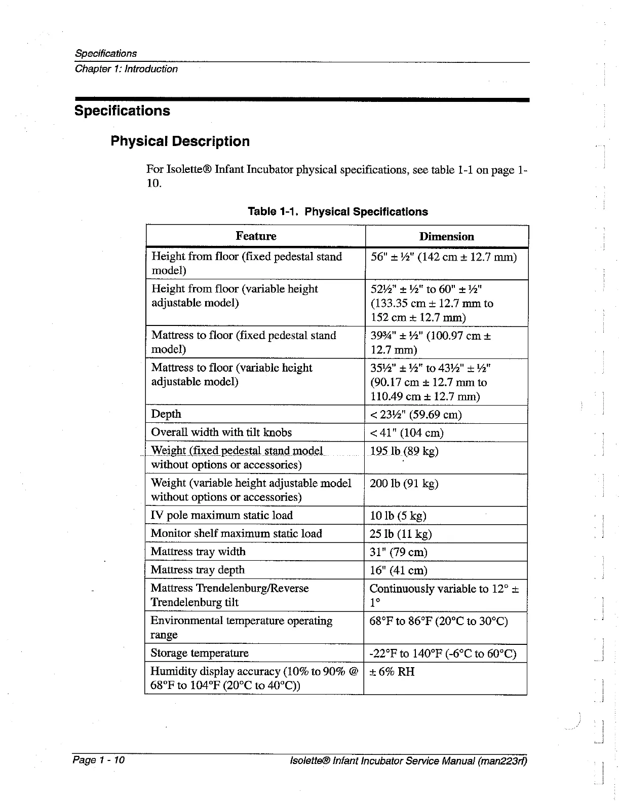 Hill-Rom Isolette C2000 - Specifications