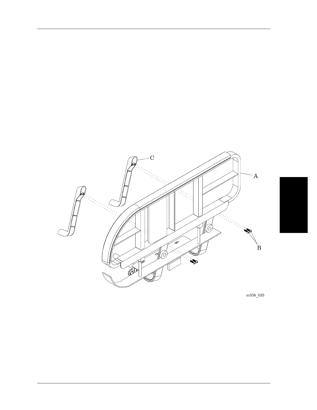 2. Remove the two screws (B) that attach the siderail wire cover (C) to the
