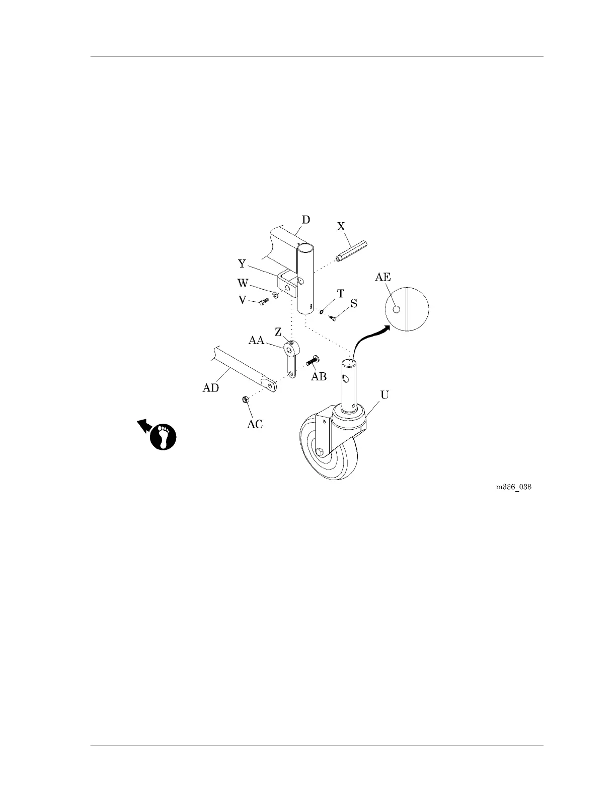 4. Remove the bolt (S) and washer (T) that attach the brake caster (U) to the