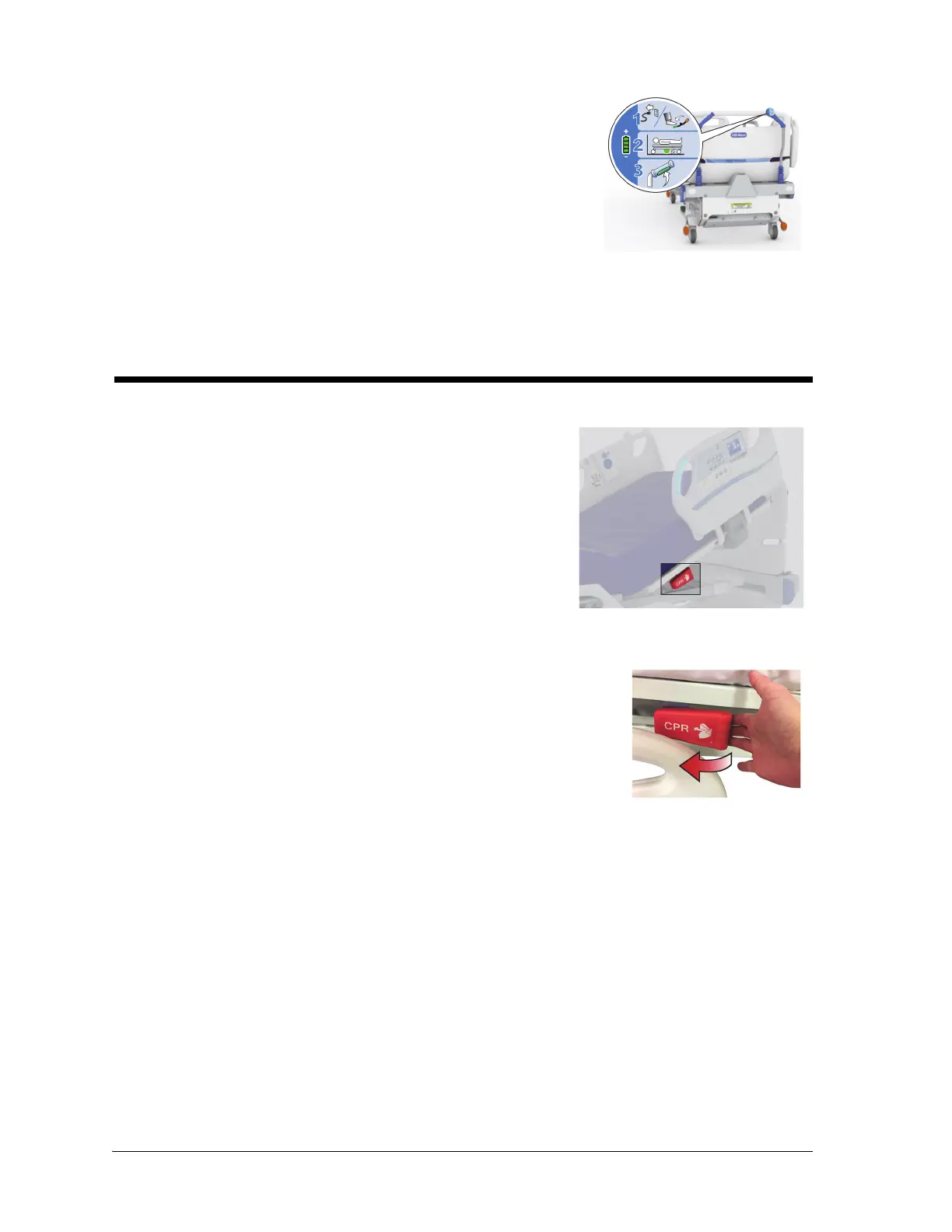 A red CPR release handle is on both sides of the upper frame in