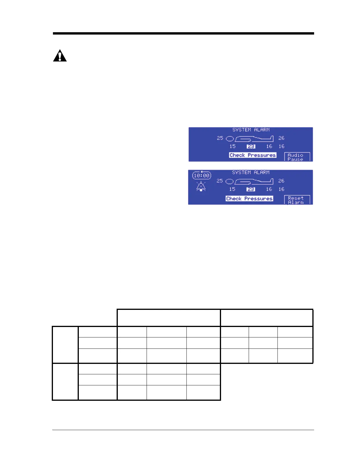 – Refer to the table below to find which air cells and hose(s) caused the alarm condition.