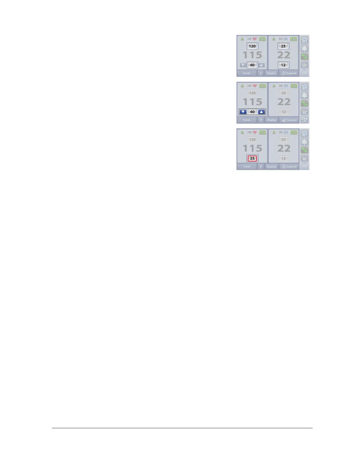 threshold. A low priority alarm will sound for HR and/or RR alarms, and a triple beep alert will sound for