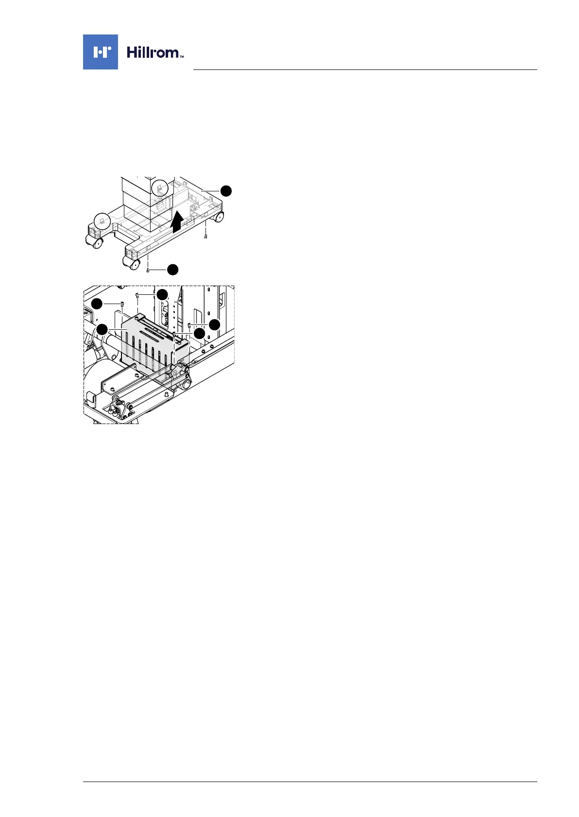 4. Loosen the running gear metal cover [1] (4 screws [2]).