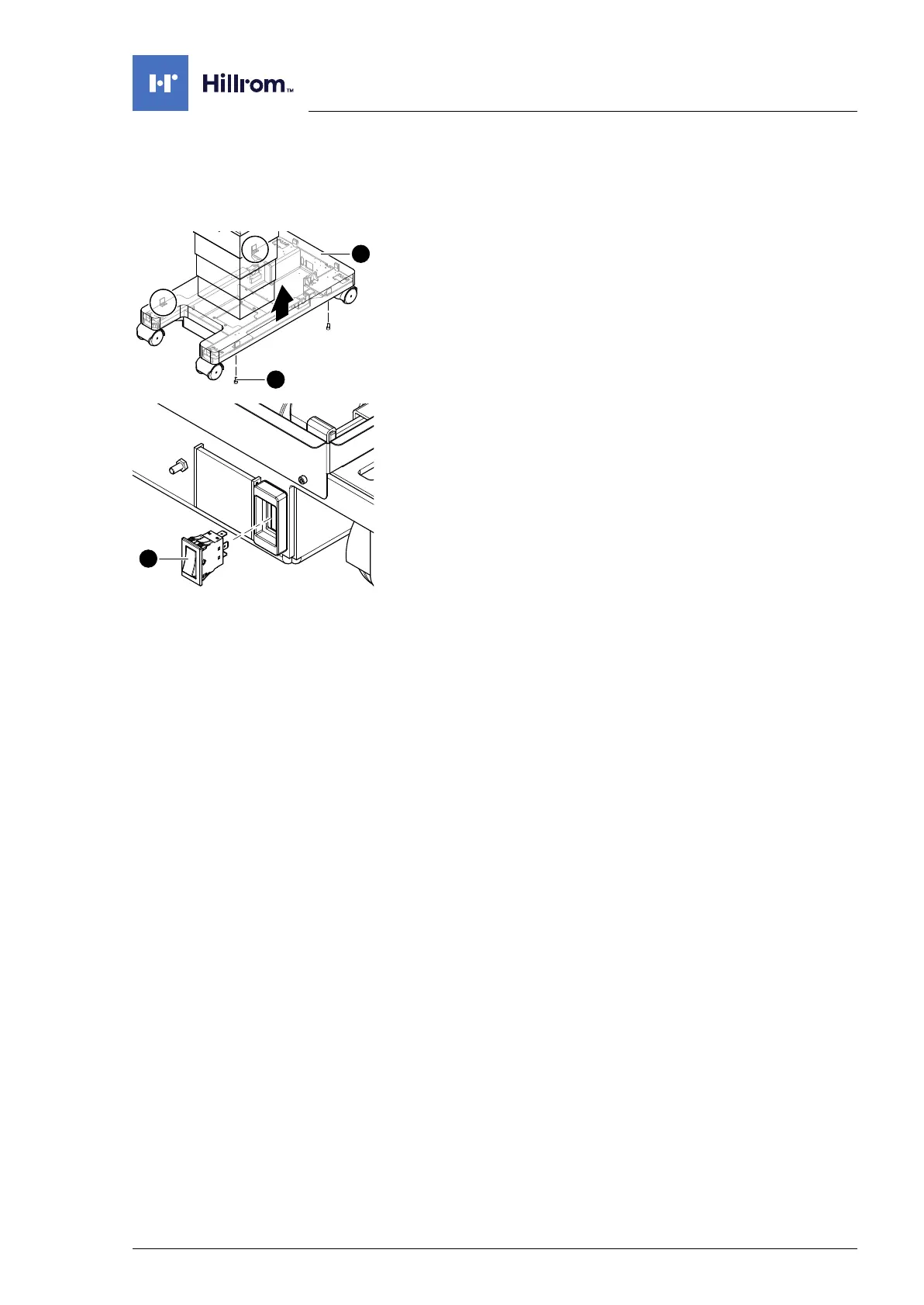 4. Loosen the running gear metal cover [1] (4 screws [2]).