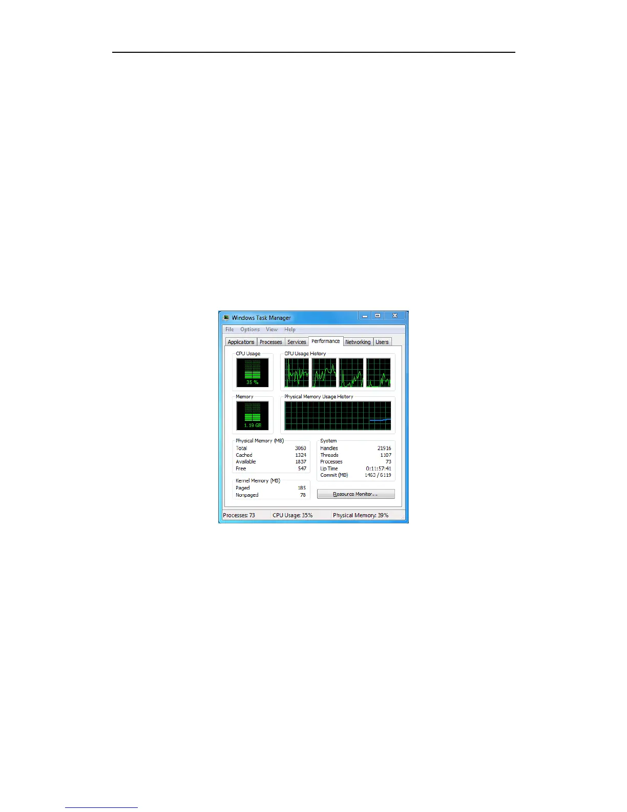 Select the “Performance” tab; check the status of the CPU and Memory.