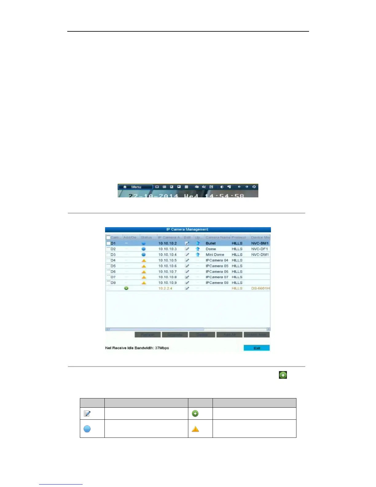 can get a live view or record of the video, you should add the network cameras to the connection list of the device.