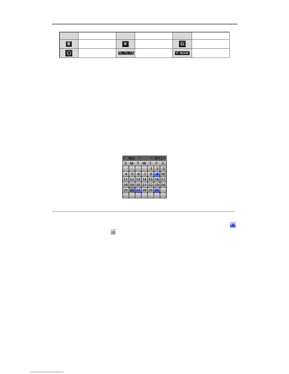If there are record files for that camera in that day, in the calendar, the icon for that day is displayed as .