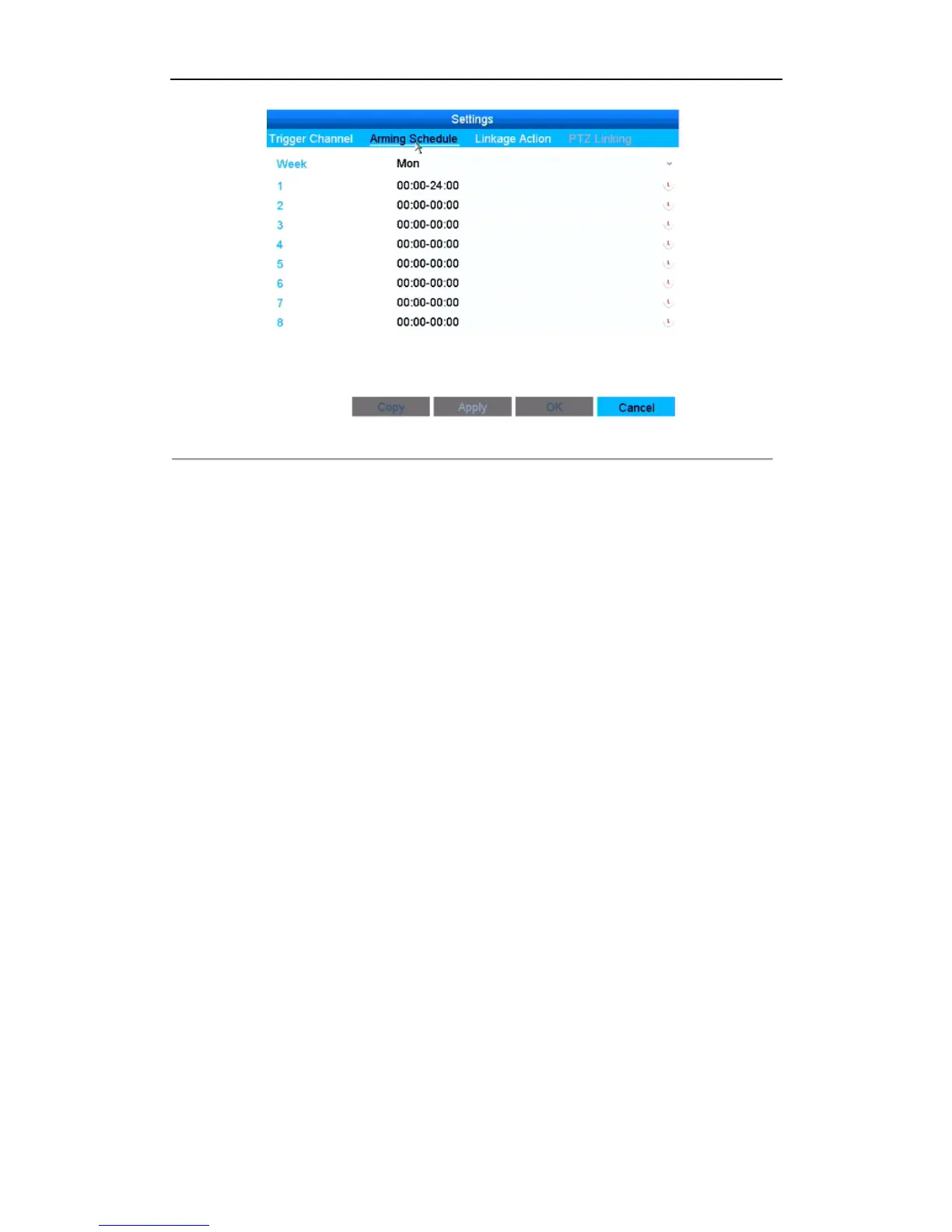 Repeat the above steps to set up arming schedule of other days of a week. You can also use Copy button to