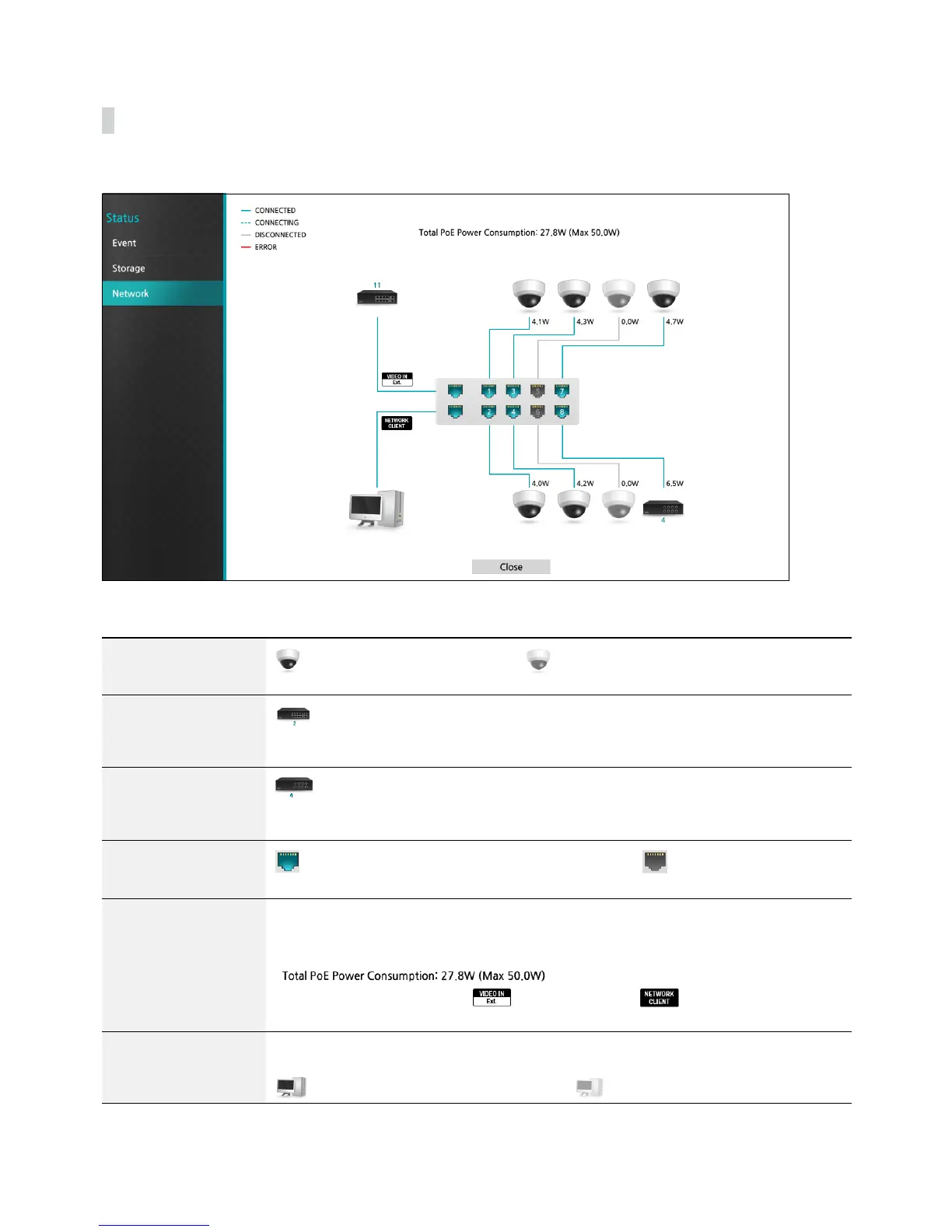 Information shown include camera connection status, LAN port link status, power consumption, number of connected