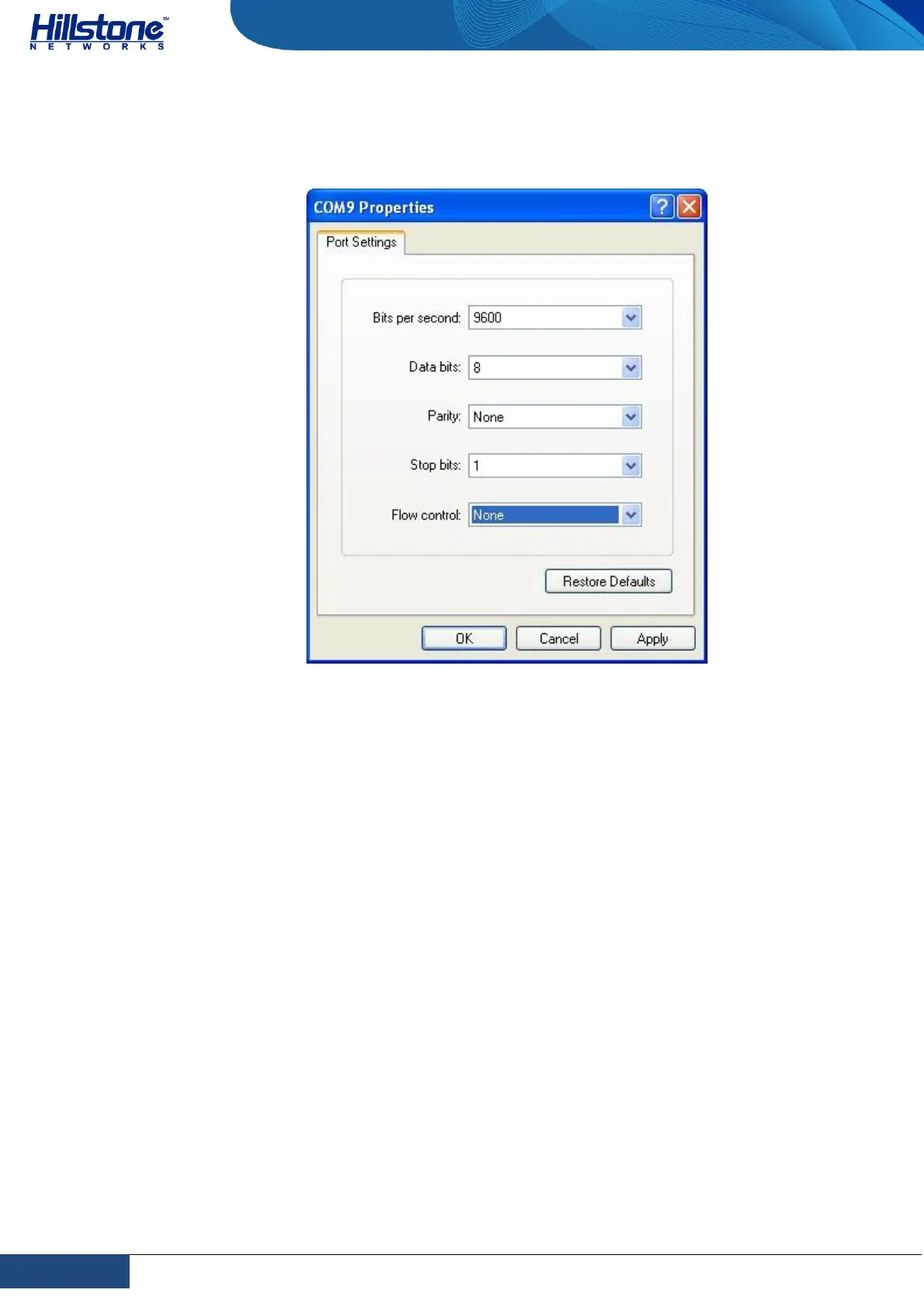terminal session to 9600bps, 8 data bits, 1 stop bit, none parity, and none