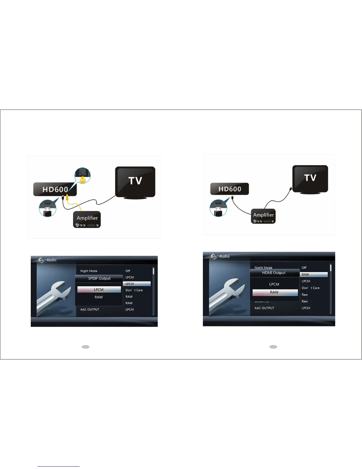 3. On the media player, select Setup?Audio?HDMI Output?RAW.