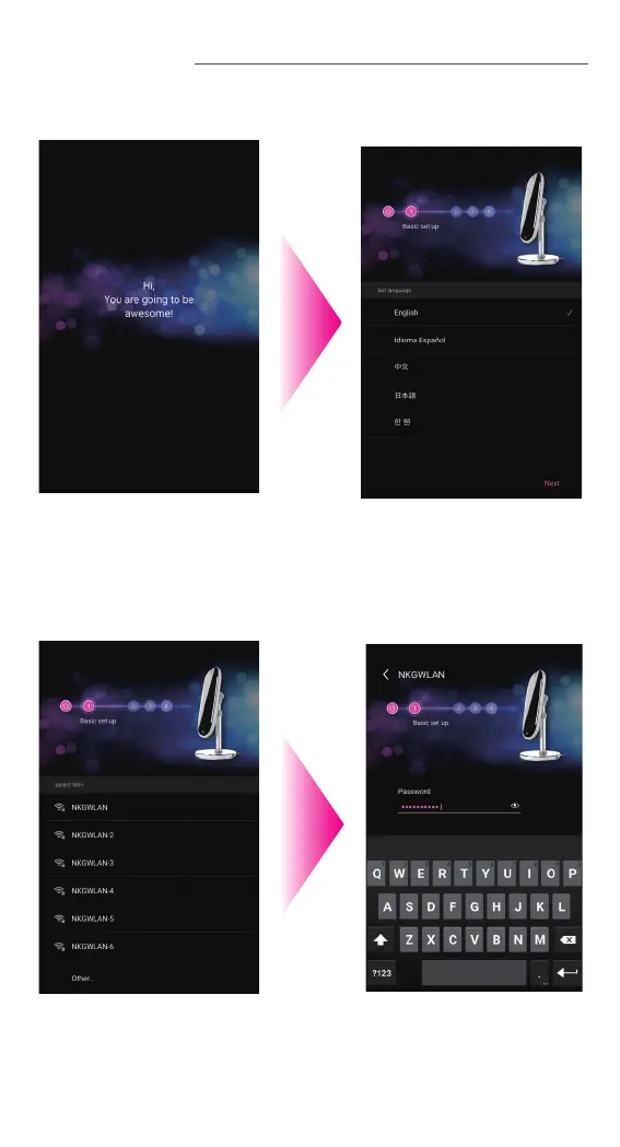 HiMirror Mini - Initial Device Setup: Language and Network; Language and WiFi Network Connection; Account Creation or Existing Login