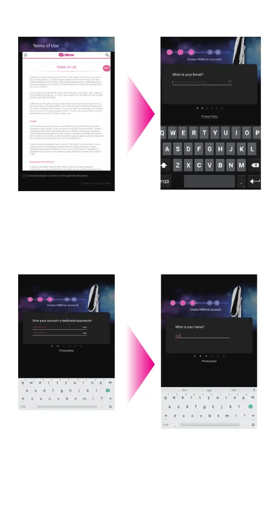 HiMirror Mini - New User Account Registration Process; Email and Password Entry; Personal Information Input for Profile