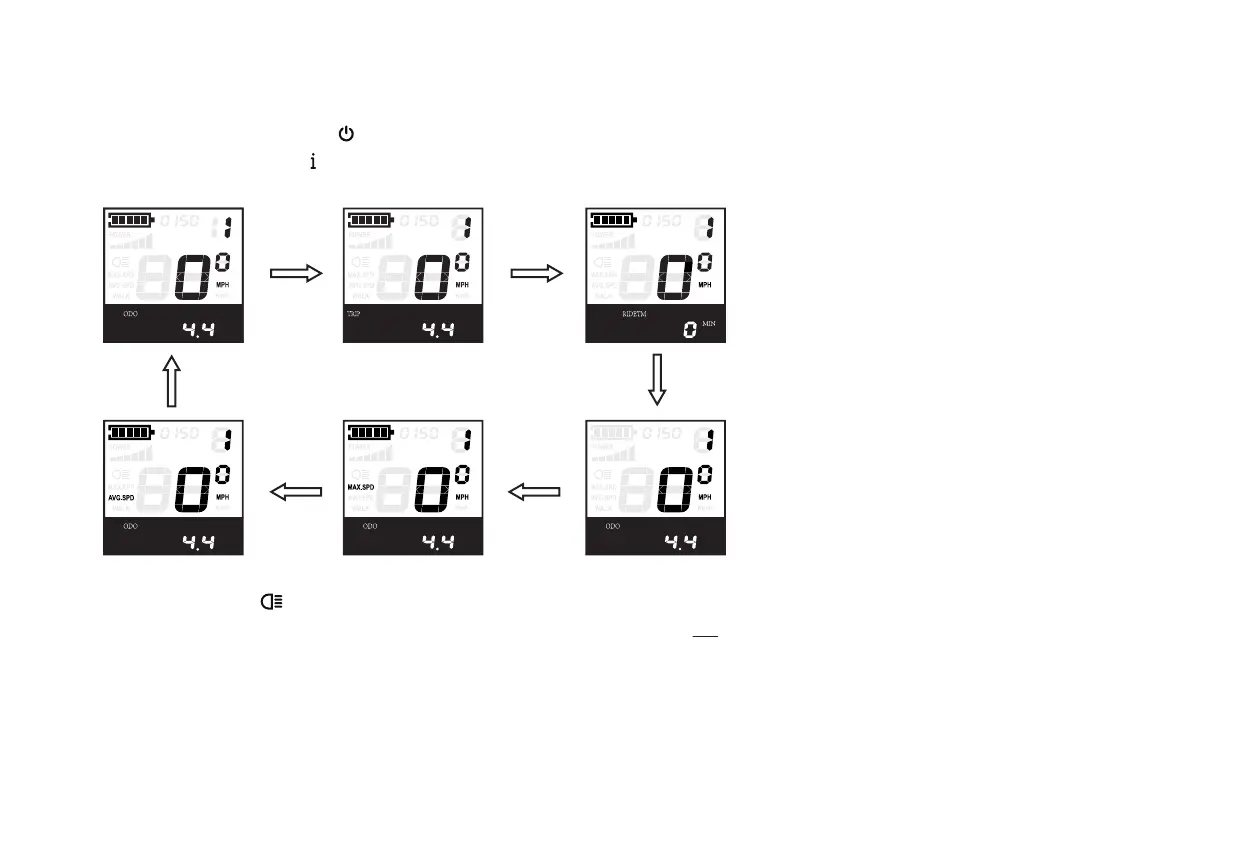 Press the information button “ ” on the control panel to cycle through the display settings: odometer, trip meter, max speed, and average speed.