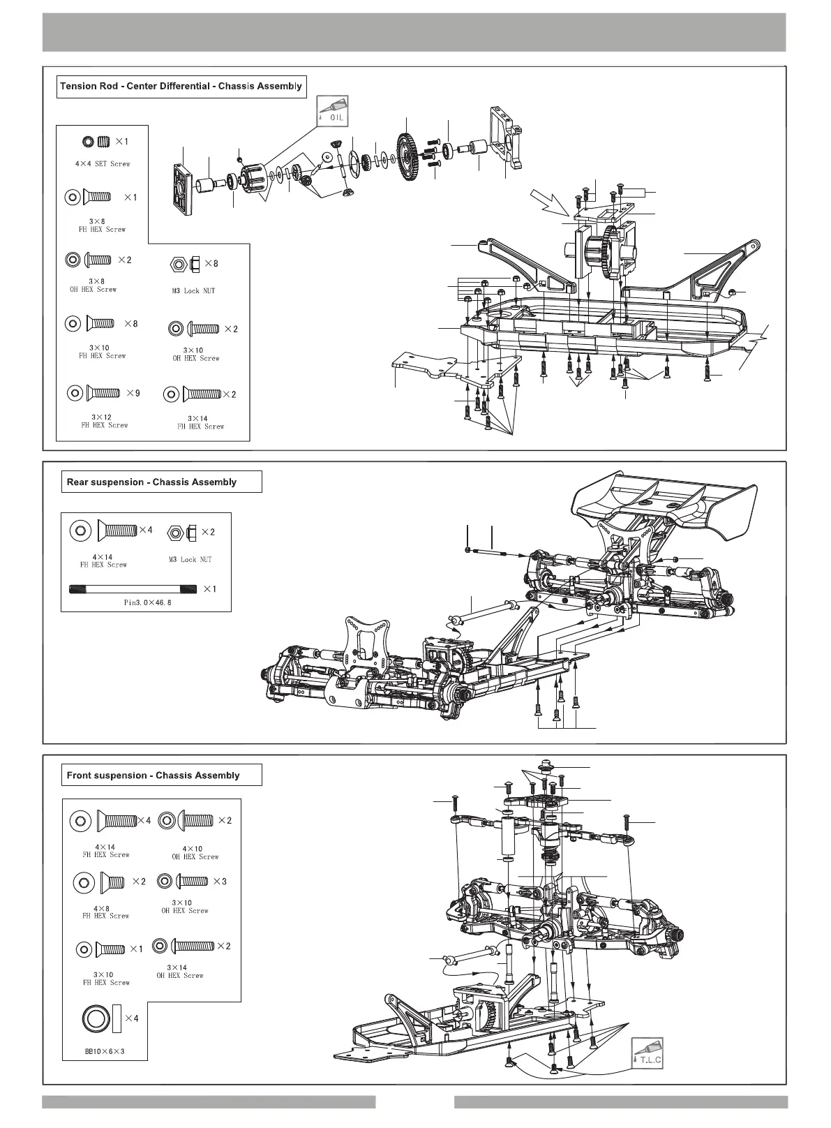 Himoto E8XBL - Tension Rod - Center Differential - Chassis Assembly; Rear Suspension - Chassis Assembly; Front Suspension
