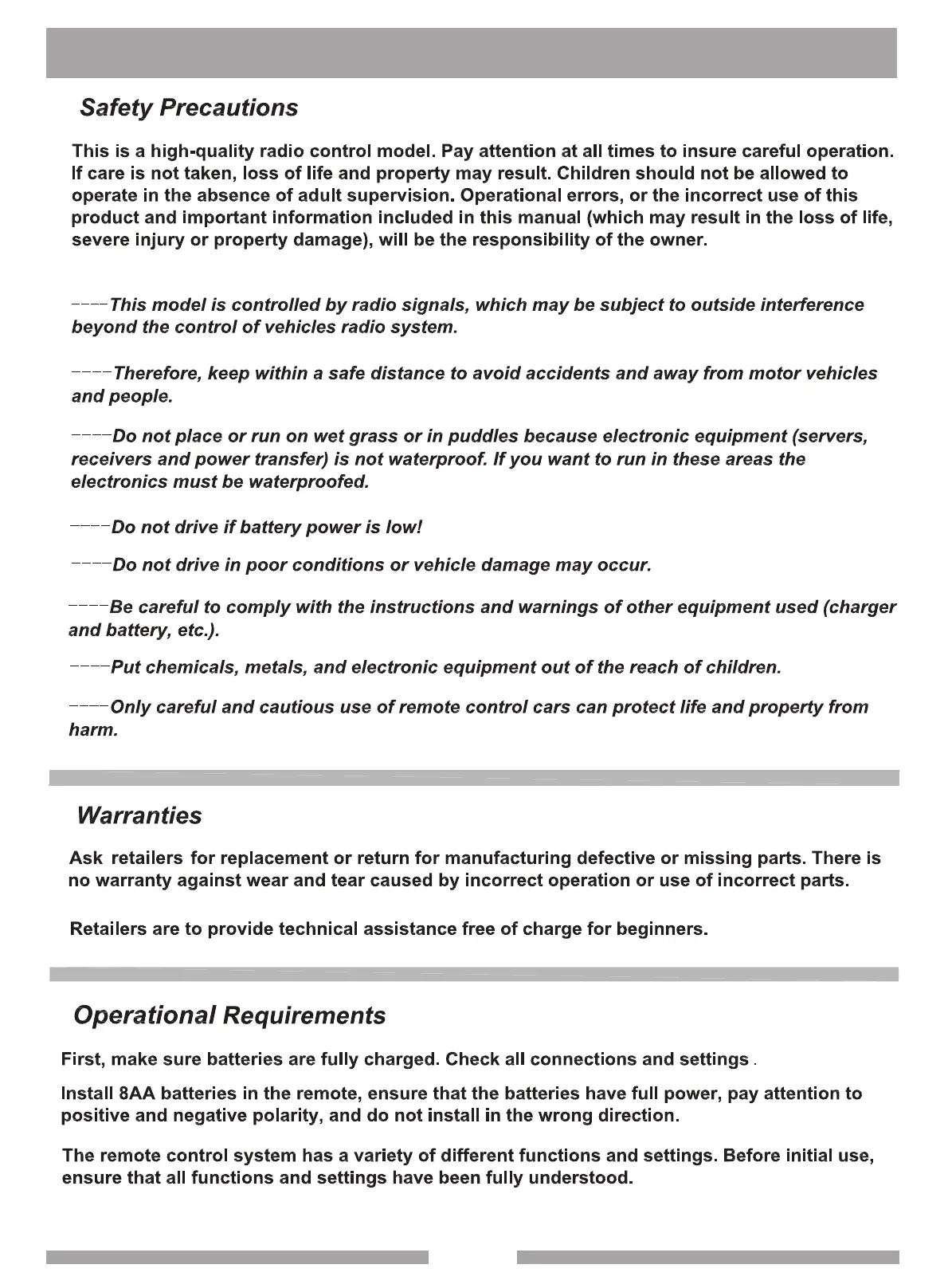 Himoto E8XBL - Safety Precautions; Operational Requirements