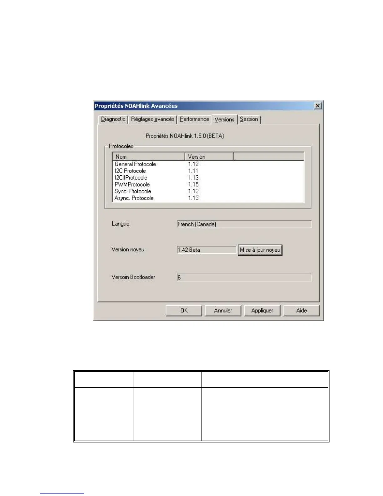 L‟onglet Versions liste les numéros de version logicielle et vous