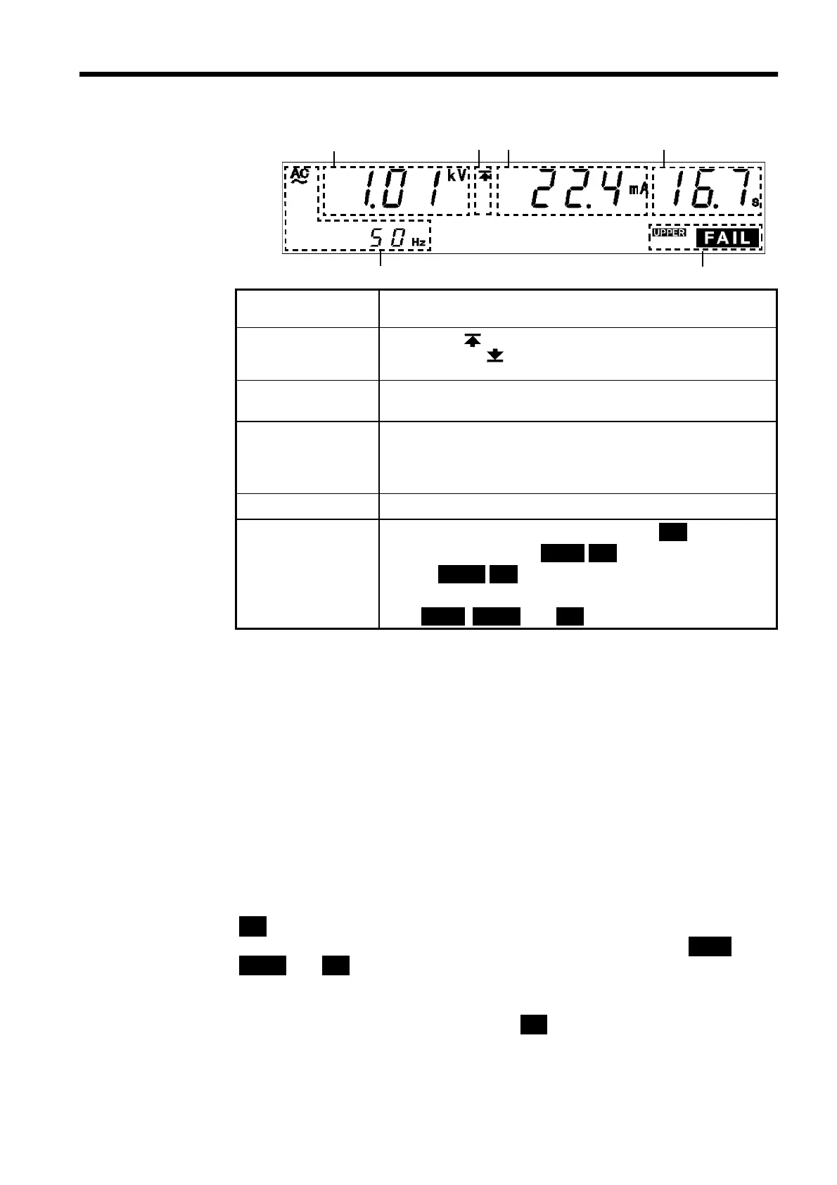 Indicates the test type (AC 50 Hz, AC 60 Hz or DC.)
