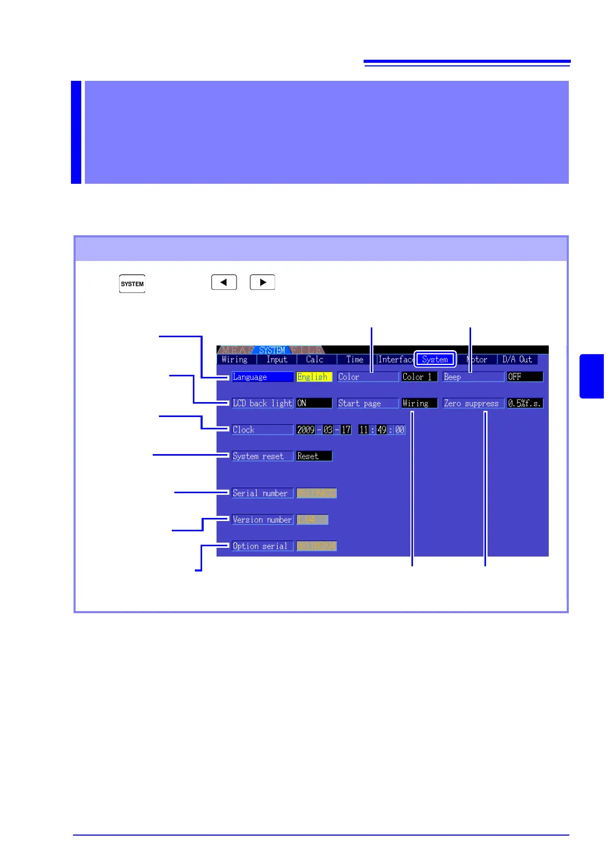 On the [System] page, view the instrument's version information and change settings such as display