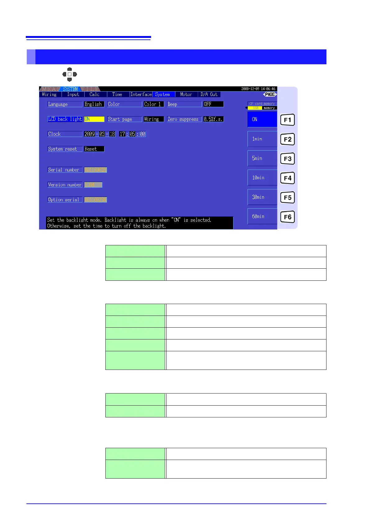 Use the keys to select an item, and the F keys to change its setting.