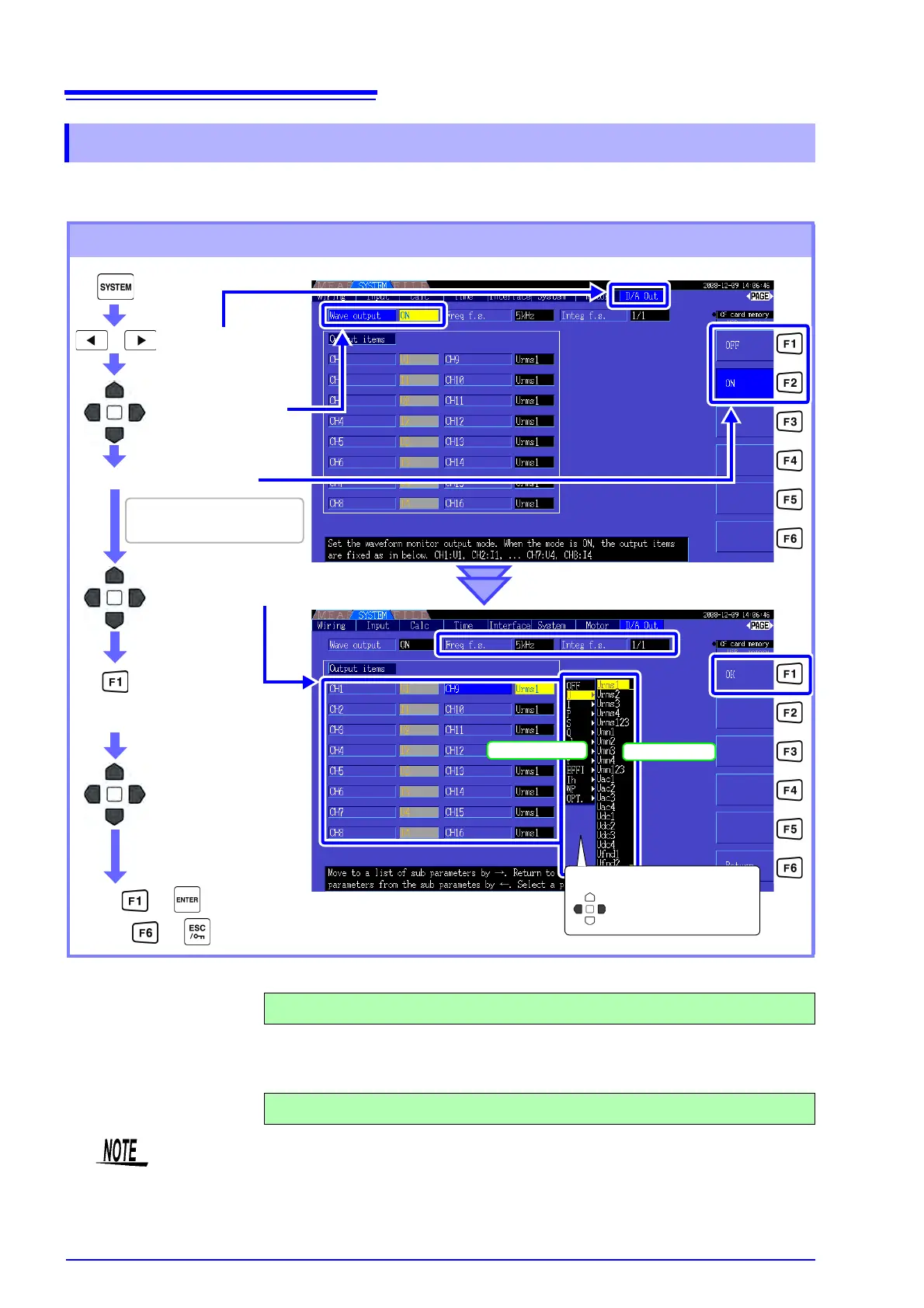 • Items selected on the MEAS, SYSTEM or FILE screen are always output.