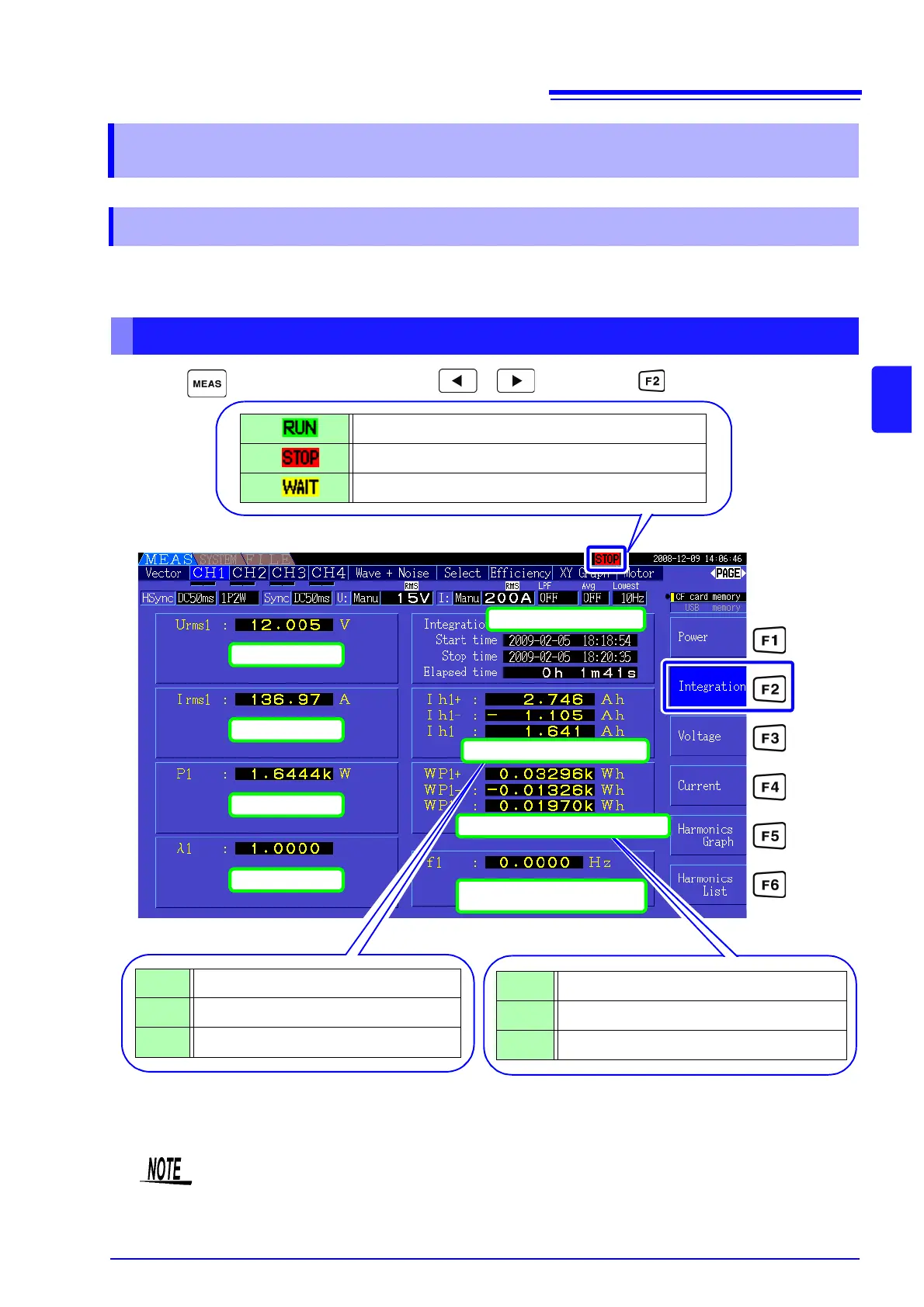 Current (I) and active power (P) are integrated on all channels simultaneously. Positive, negative and