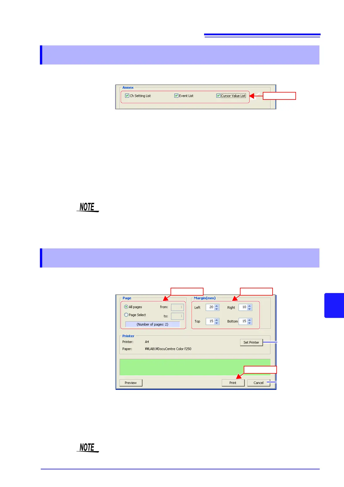 Prints the list of Cursor A Measurement Values and Cursor B Measurement Val-