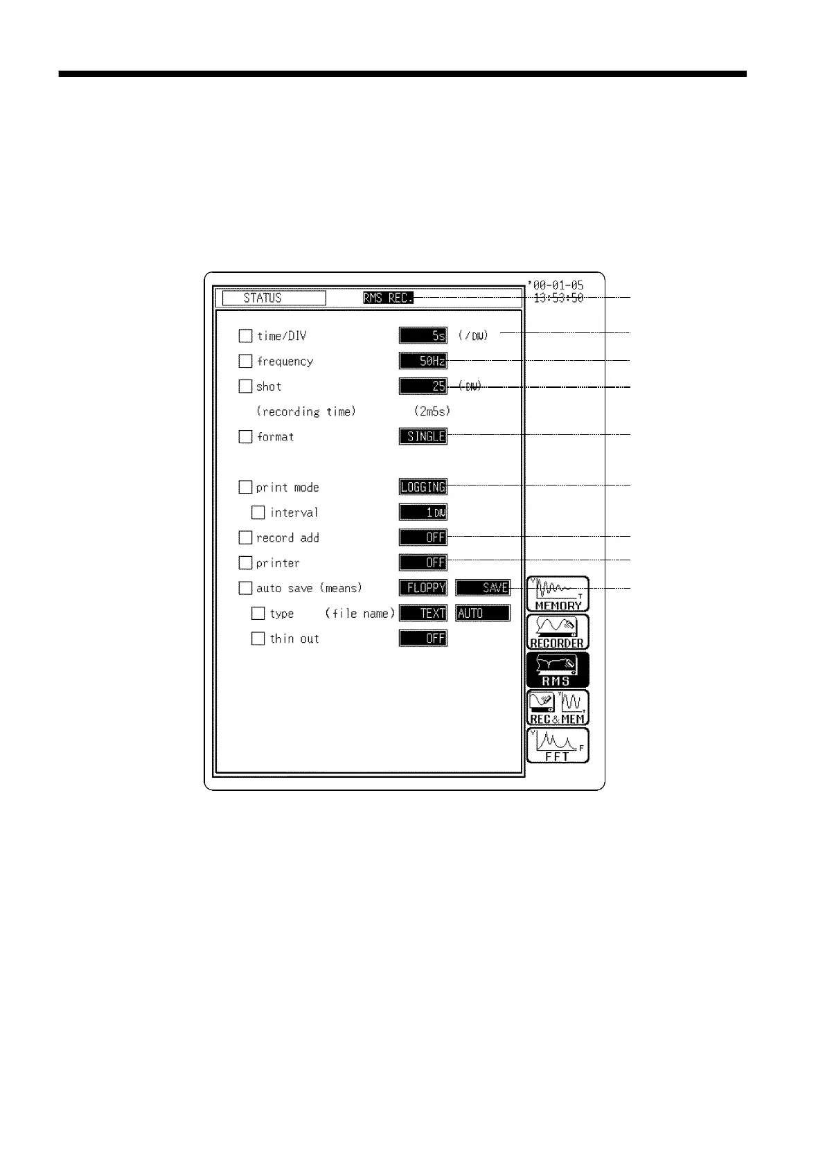 how to set the STATUS screen of the RMS recorder function. See the