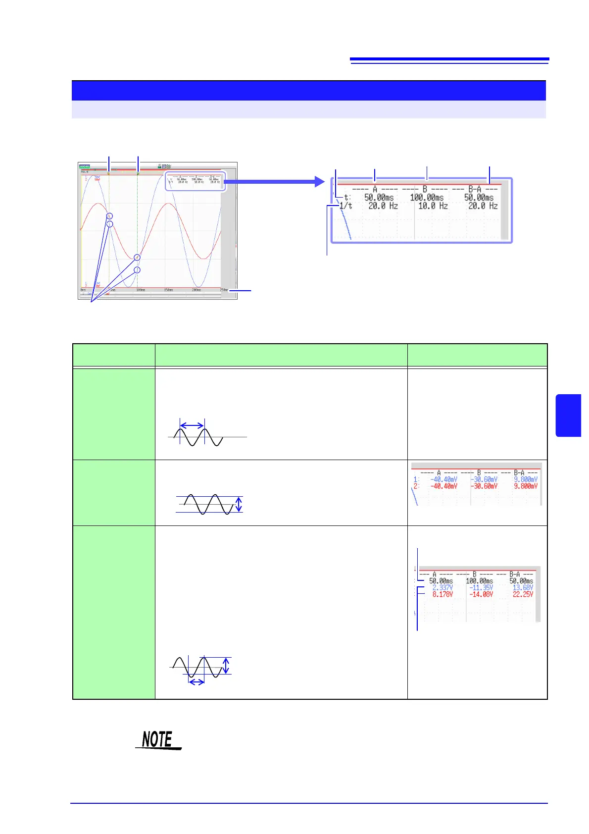 t:A, B each cursor value: Time from trigger point or recording