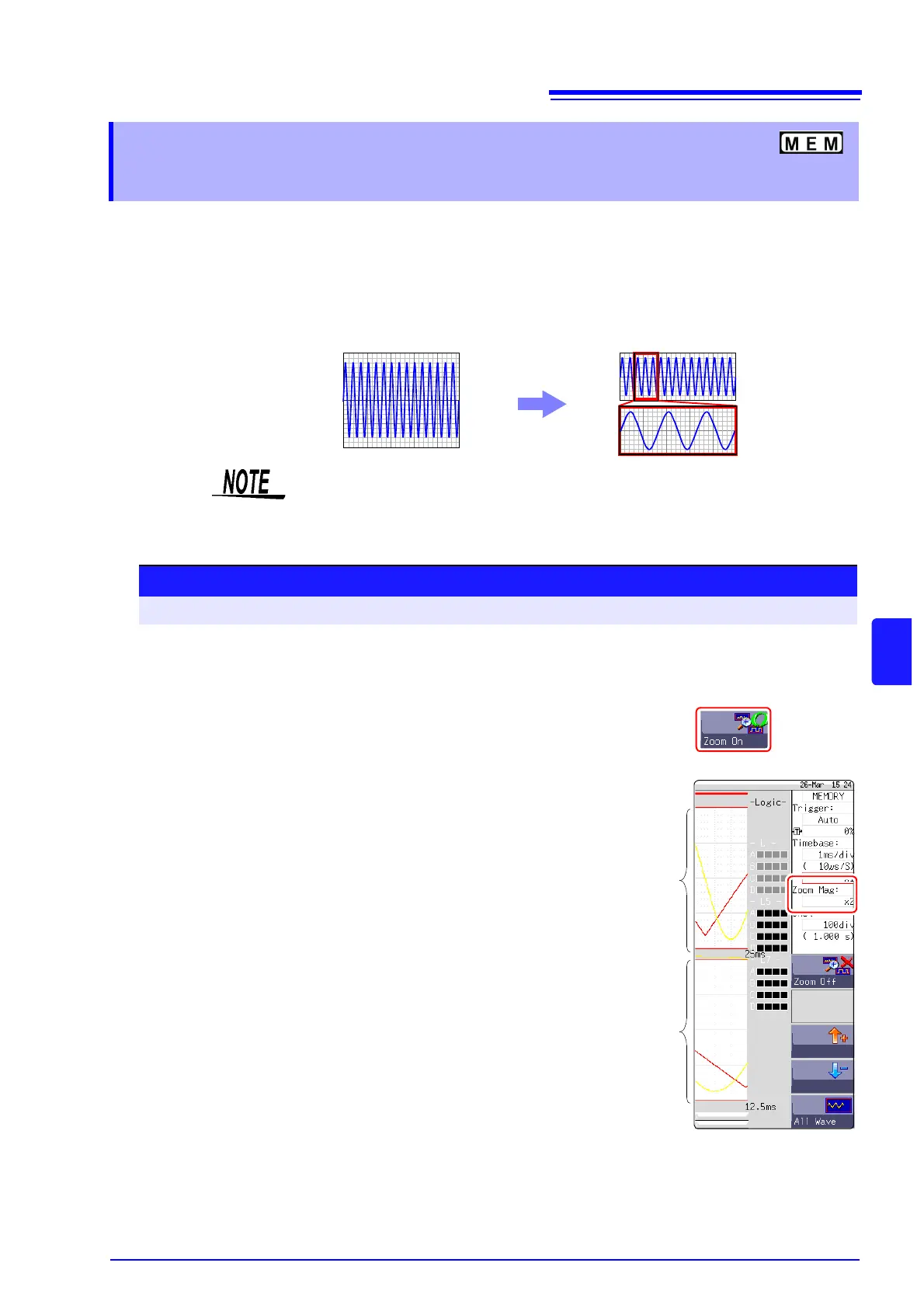 (Upper: waveform to be magnified, Lower: magnified (zoomed) section of