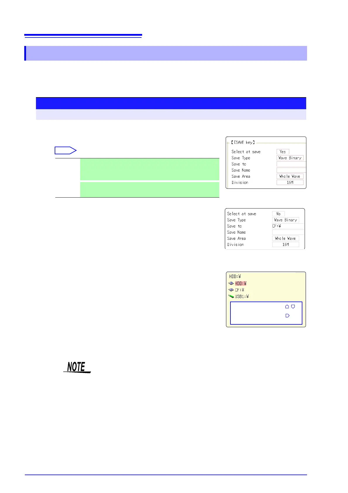 data to be saved are as following. (Settings data, waveform data, display screens, waveform