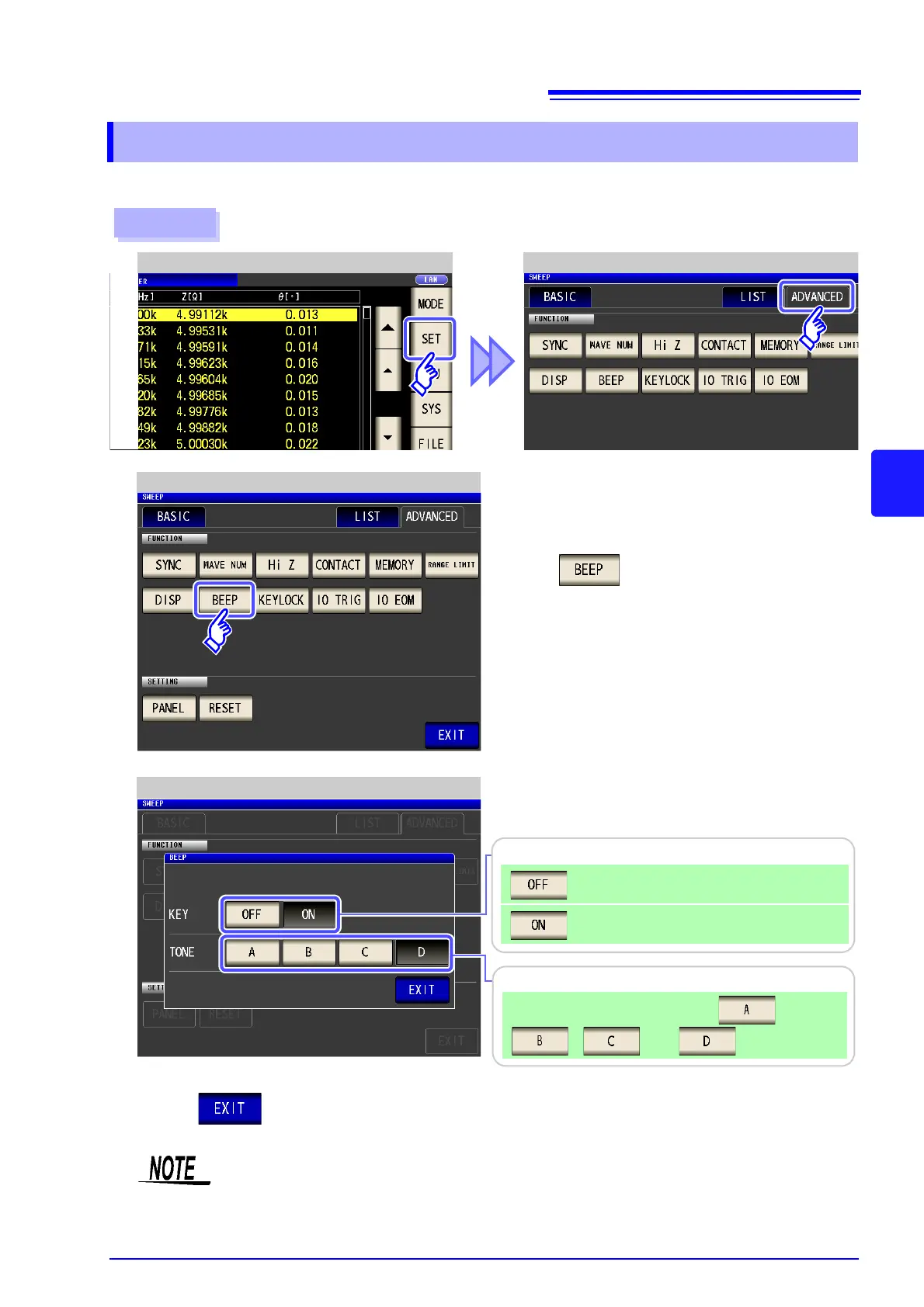 You can set the operation sound and each of the beep sounds for judgment results.