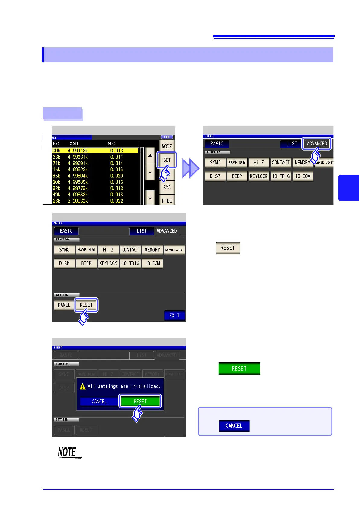 • Performing a system reset causes the instrument to return to its default factory settings.