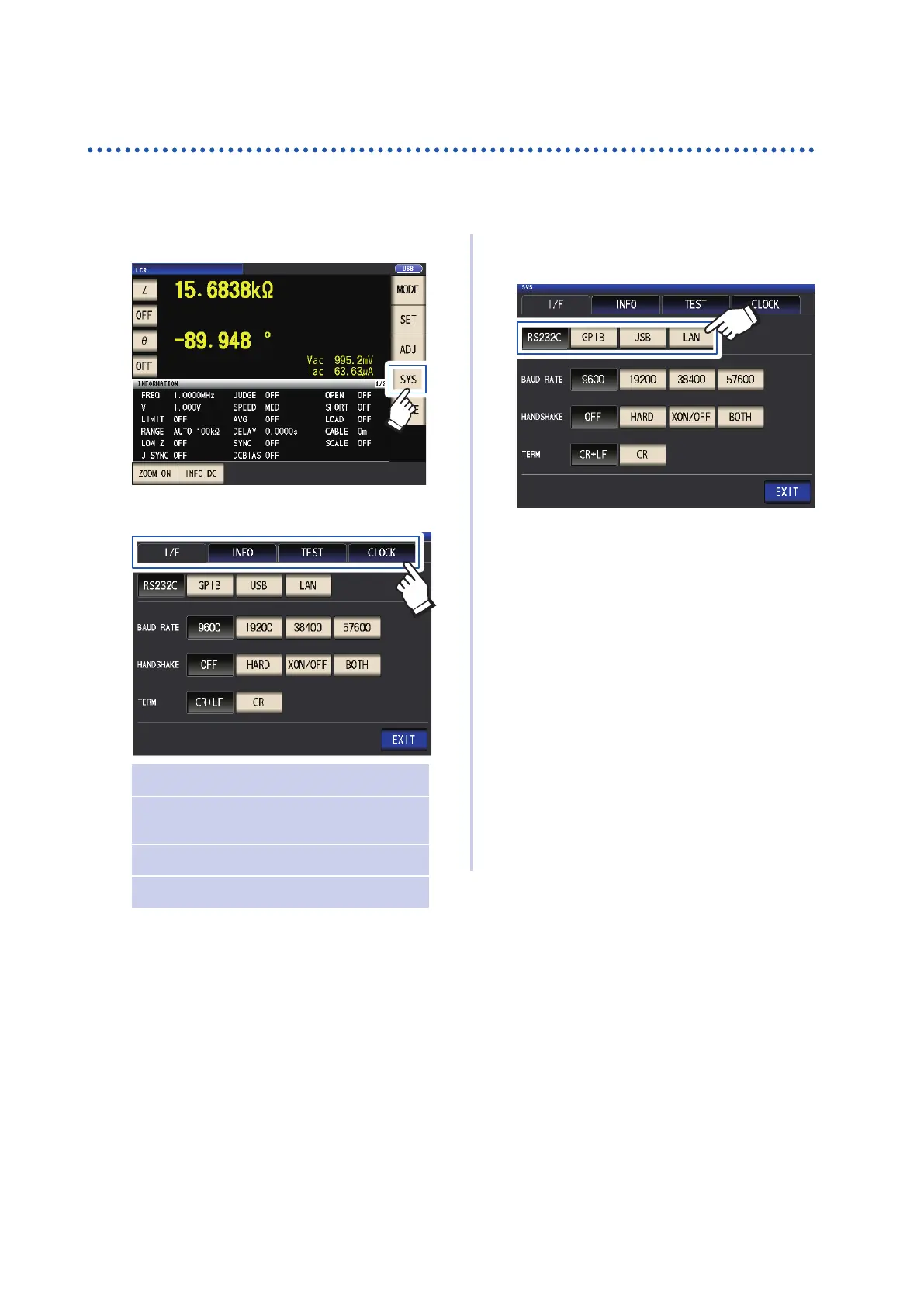 This screen is used to congure the instrument’s interfaces, to set the time and date, and to check