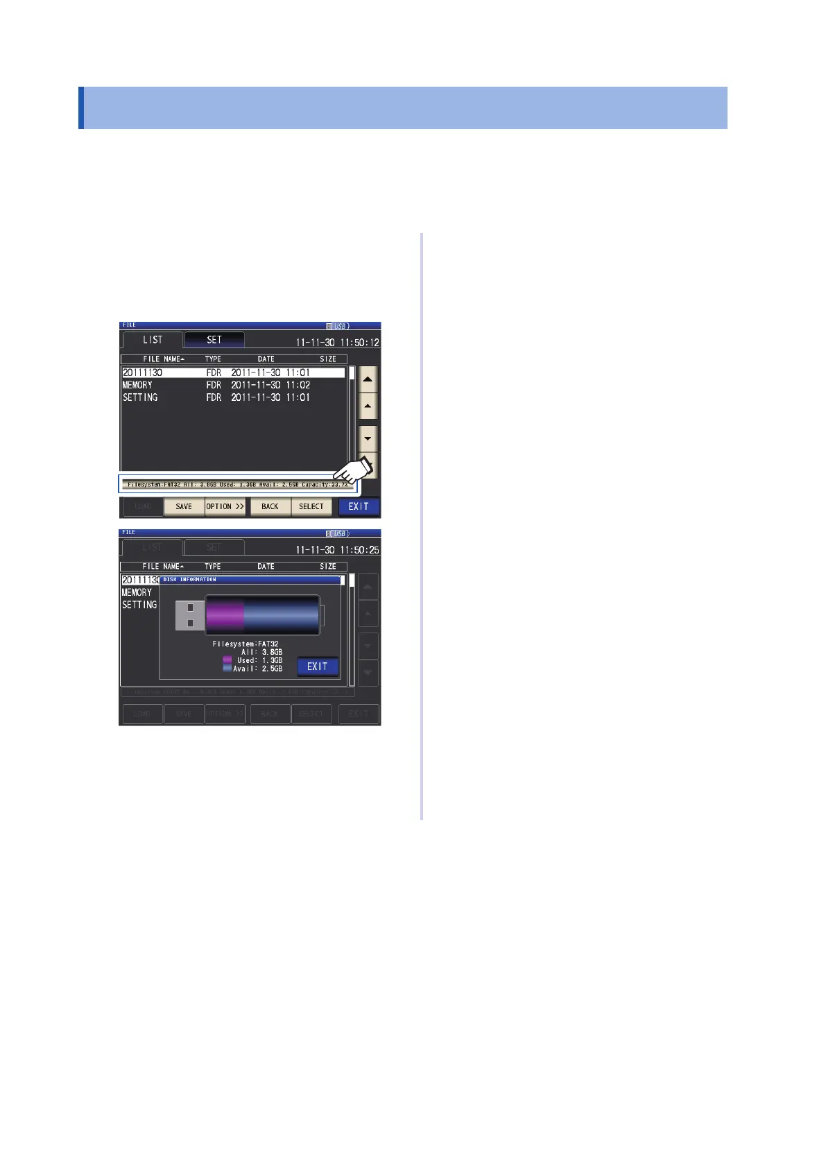 (Measurement screen) FILE key>(FILE screen) LIST tab