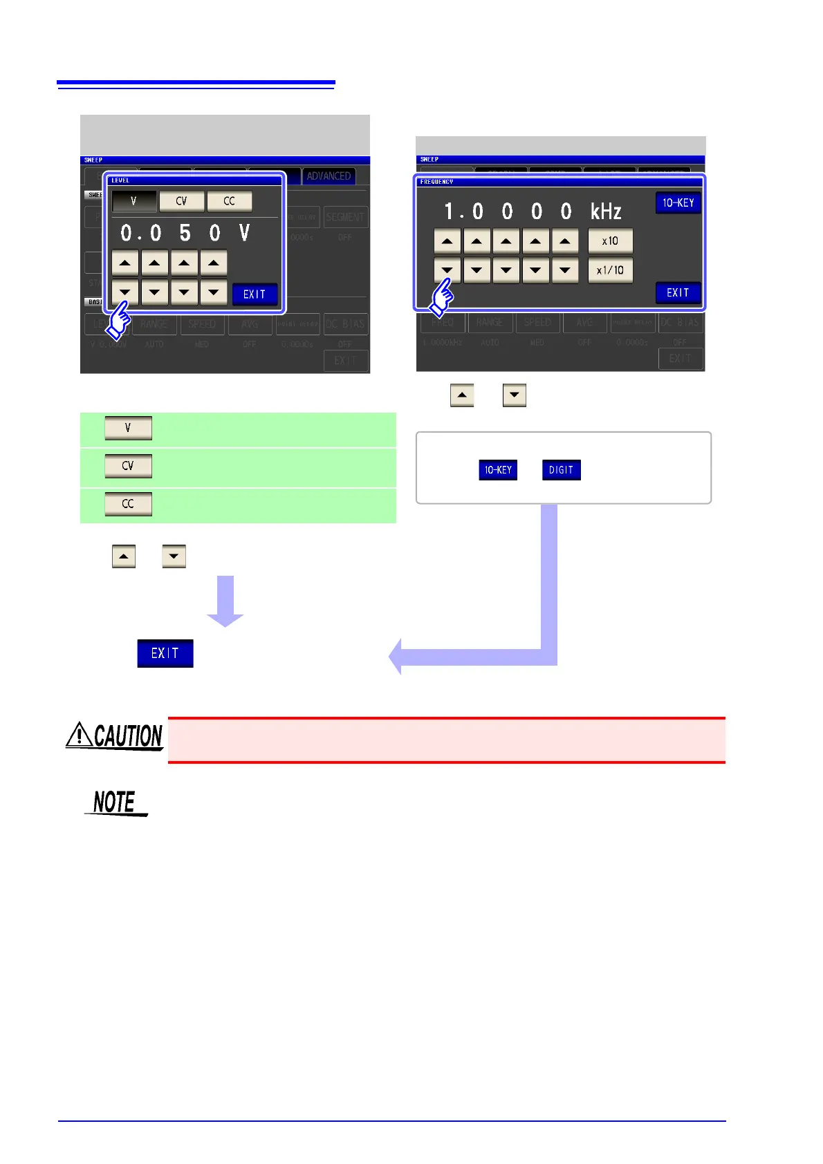 The frequency and measurement level that can be set vary depending on the set sweep