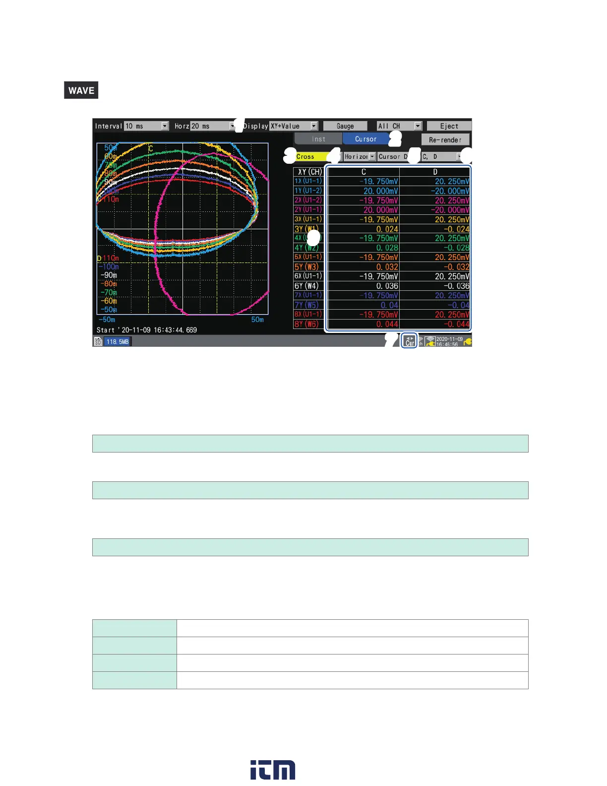 Check the measured values at the C and D cursors.